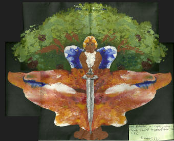 Don't miss "Corruption in our children's textbooks." (ORIGINAL ASSIGNMENT, which first led me to look closely at the textbook "Across the Centuries." My son's teacher told me it came out of the “Teacher’s Edition” of the textbook. Parents wouldn’t normally see this. My son was out this day and it was a makeup assignment.) Tree of Life and Knowledge Each animal plays a special part in the Hindu view of life and its addition of the tree would be a reflection of the view of that symbol in the artist’s life. For example, the five-headed serpent at the center is a sign of evil and danger. The goose at the end of each branch stands for the soul’s ability to take “flight”. In making your own Tree of Life focus on objects that symbolize a prized or feared, part of your own life. It need not be recognizable. Only you need to know what it means! Create your design on scratch paper, and show to the teacher. The teacher will give you a large sheet of Black construction paper. Sketch out the design. Use oil pastels to make your Tree of Life come alive. Tree of Life and Knowledge – Bronze [Here there was a picture of a Hindu tree as an example, with the trapped symbols within it.] My son responded with a picture of the Biblical angel which God placed there to guard the “Tree of Life” with a flaming sword. “God placed a mighty angel at the east of the garden of Eden, and a flaming sword which turned every way, to guard the way to the tree of life.” Genesis 3:24